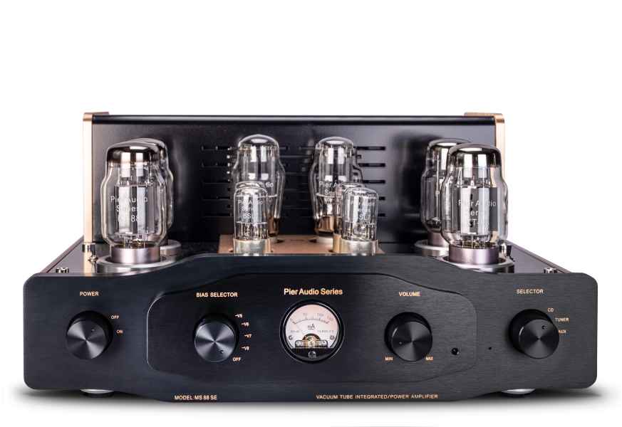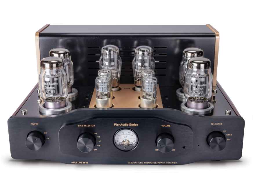 Pier Audio MS-88 SE to najbardziej wszechstronny i efektywny wzmacniacz lampowy-zintegrowany w całej lampowej ofercie Pier Audio. Oferuje potężną moc 48W na kanał „wyciśniętą” z czterech lamp KT88 zaaplikowanych w układzie PUSH-PULL. Pier Audio MS-88 SE jest w stanie „napędzić” znakomitą większość kolumn głośnikowych dostępnych na rynku audio. Brzmienie wzmacniacza charakteryzuje się dużą detalicznością, szybkością oraz żywiołowością, przy zachowaniu barwnej, lekko zaokrąglonej średnicy. „Góra” pasma jest niezwykle ciekawa, wypełniona transjentami, a bas bardzo szybki i ze względu na wysoką efektywność prądową wzmacniacza, bardzo dobrze kontrolowany. Duży udział w obraniu tego kierunku muzycznej retrospekcji ma zastosowanie przez inżynierów Pier Audio potężnego zasilacza, który potrafi zaspokoić „apetyt prądowy” nawet najtrudniejszych kolumn głośnikowych. Dzięki temu konstrukcja Pier Audio MS-88 SE podczas pracy potrafi zbudować niezwykle dużą, przestrzenną i przejrzystą scenę dźwiękową, doskonale wypełnioną tym, co oferują artyści w nagraniu. W konsekwencji słuchacz jest niejako „zanurzony” w muzycznych doznaniach, które otaczają go z wielu stron. Pracę tego wzmacniacza cechuje przede wszystkim niespotykana w tej klasie cenowej swoboda z jaką wysterowywuje on nawet duże czteroprzetwornikowe kolumny głośnikowe.